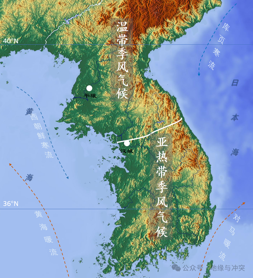 半岛大体位于北纬34°到42°之间,北邻中国大陆,东西南三面环海,降水量800-1500毫米之间。