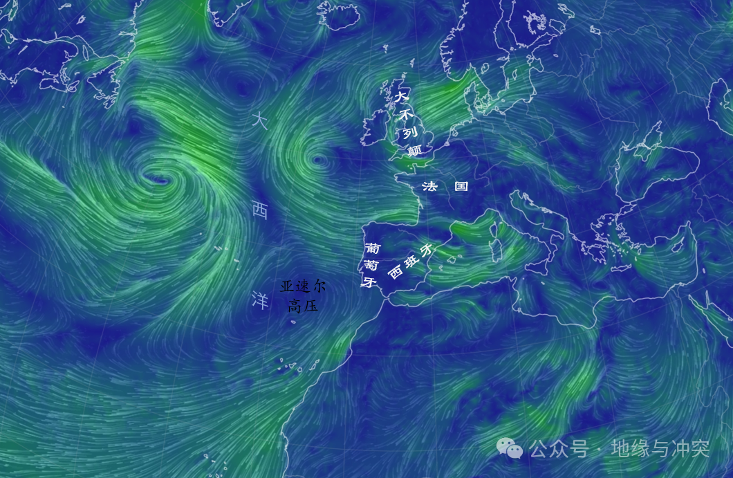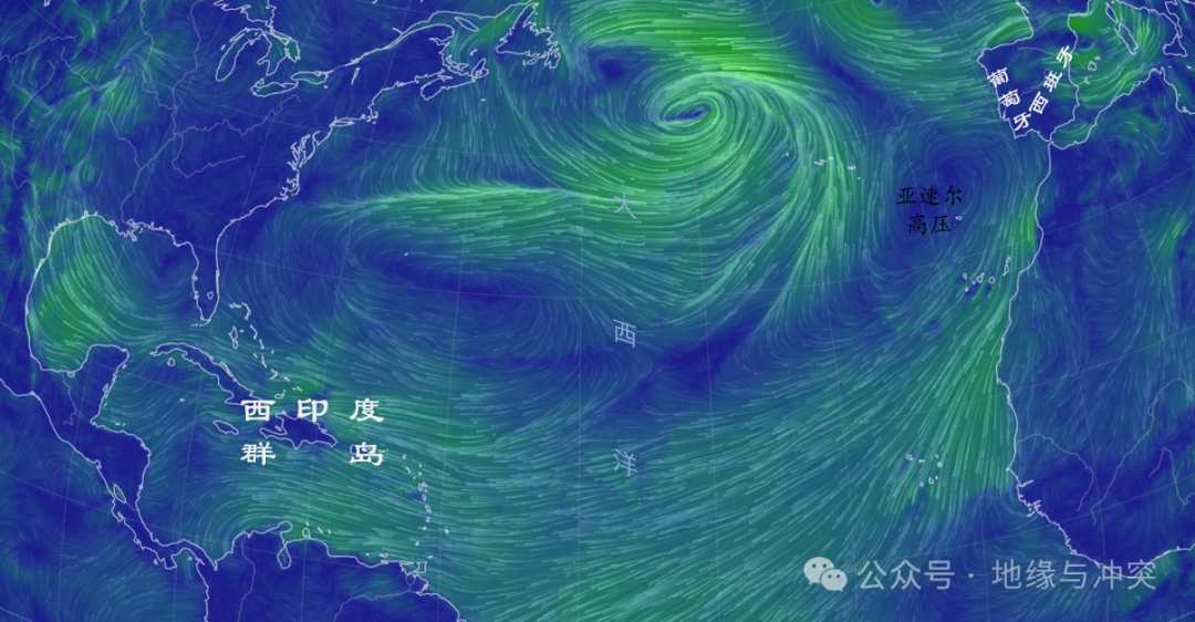 而西班牙和葡萄牙纬度较低,在西风带和副热带高压带交界位置,西侧大西洋上的亚速尔高压,让风向从西班牙和葡萄牙本土一路西南,吹到美洲的西印度群岛,美洲就是这么被发现的。