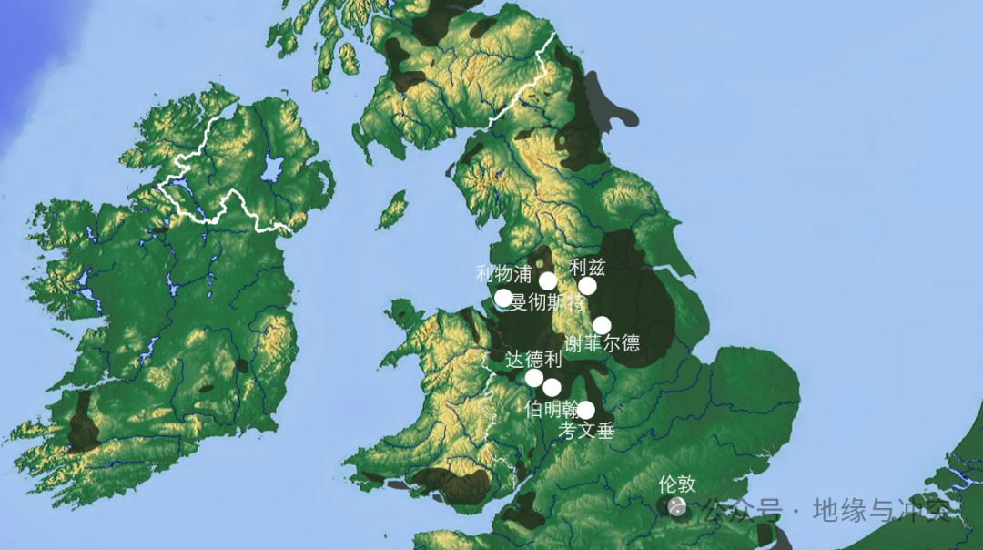 英格兰中部大量工业城市兴起,利物浦、曼彻斯特、利兹、伯明翰等城市群形成,英国形成中部工业中心,南部伦敦金融市场中心的格局。