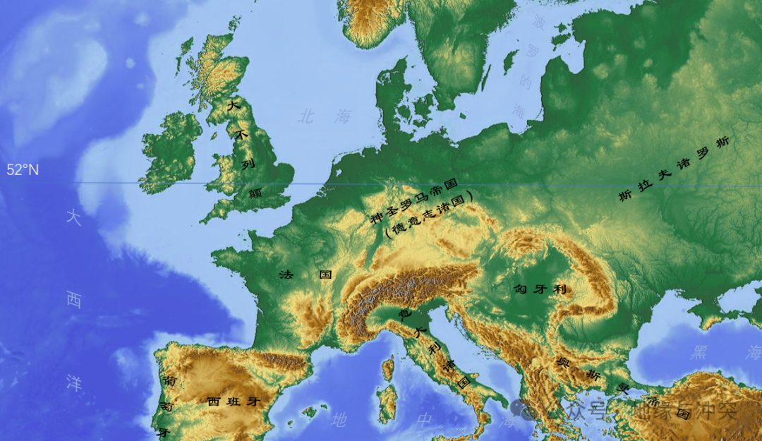 在亚洲,北纬42°线以北几乎不具备农耕生产条件;在欧洲,北大西洋暖流让农耕纬度北界推至北纬52°附近。