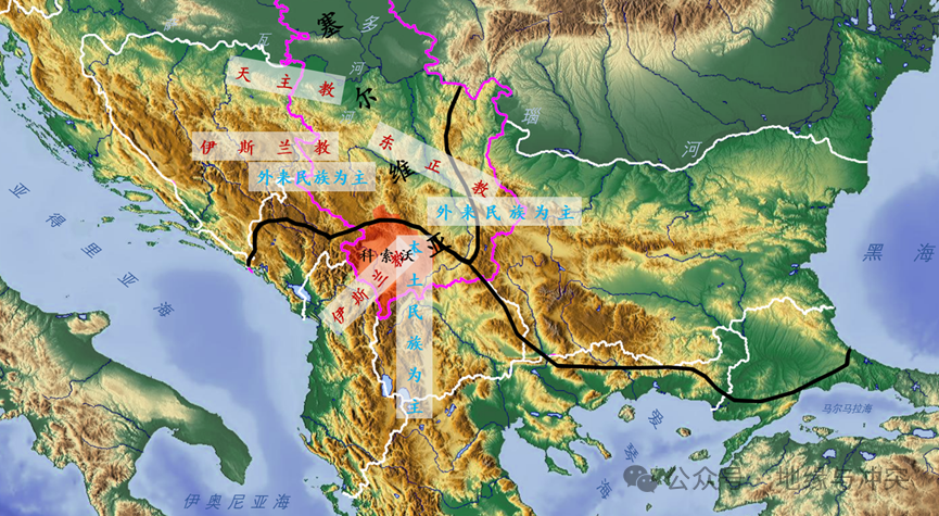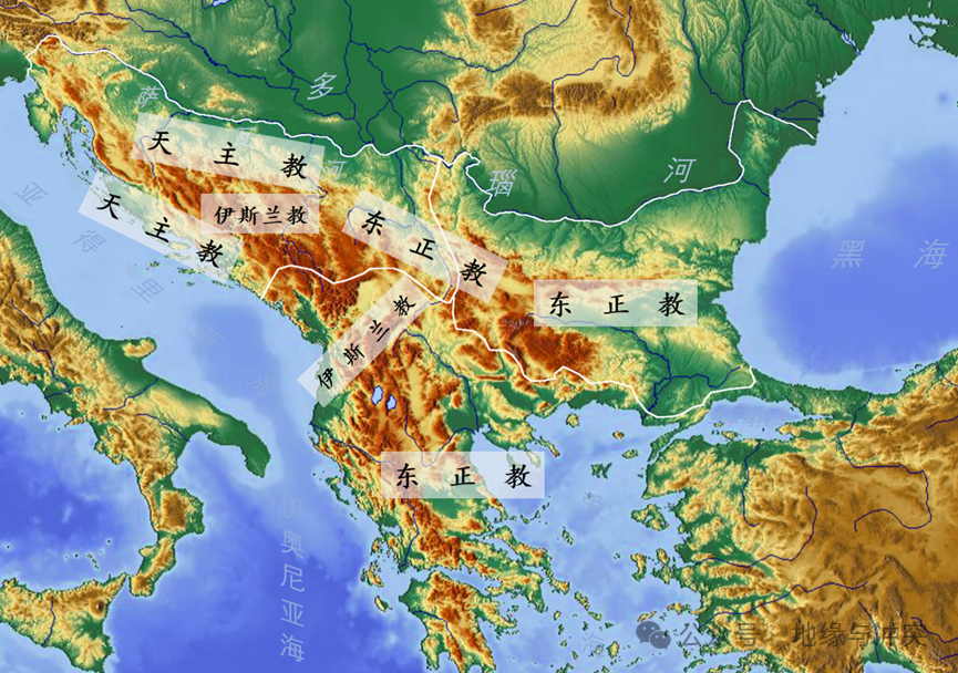 伊利里亚:西侧面临亚得里亚海,和意大利的亚平宁半岛隔海相望,距离上和西欧更近,是罗马帝国最早征服的巴尔干地区。其沿海地区长期受北意大利城邦统治,贸易发达,在宗教和文化上深受西欧影响,主要信仰天主教;北部萨瓦河沿岸是伊利里亚主要平原所在地,是本区域的人口核心,但经常遭受来自匈牙利盆地的游牧势力冲击,民族成分错综复杂,靠近西欧的西北侧信仰天主教,东南侧信仰东正教。内部山地(波黑)交通闭塞,在奥斯曼统治时期,不少改宗伊斯兰教。