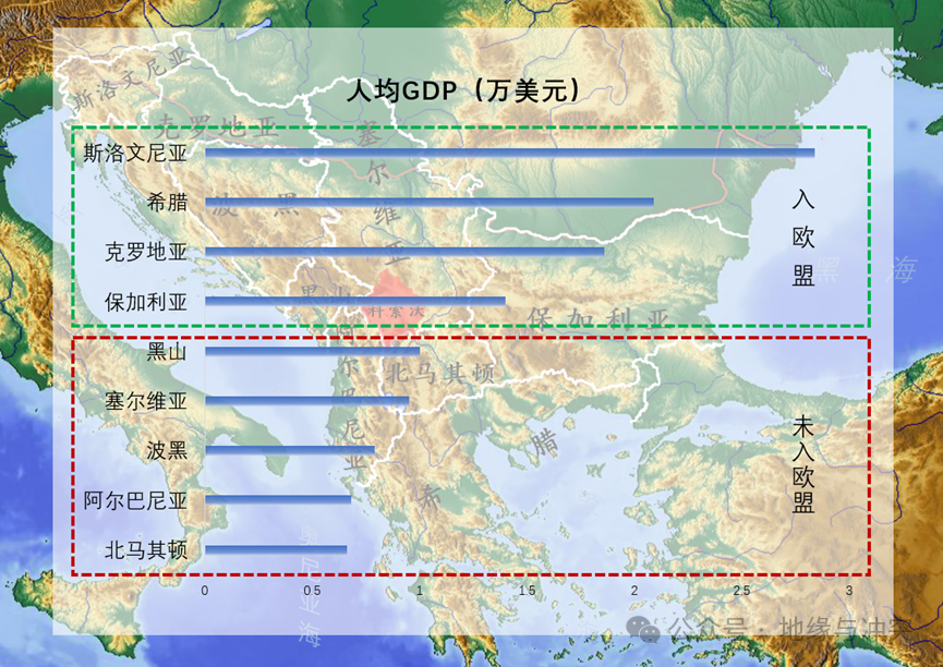 当前巴尔干诸国中,斯洛文尼亚、希腊、克罗地亚、保加利亚均是欧盟成员国,人均GDP比未入盟的塞尔维亚、黑山、波黑、阿尔巴尼亚和北马其顿高出一大截。