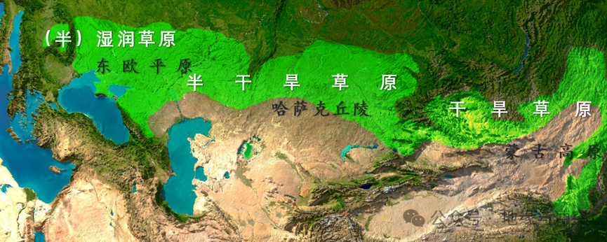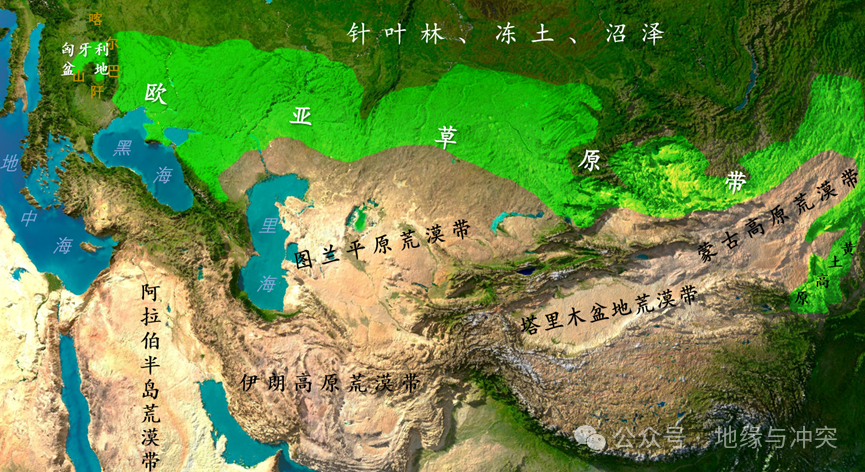 在南部荒漠带和北部针叶林过渡地带,形成了一条东西向的草原带,这就是欧亚草原。