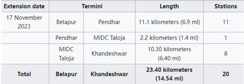 新孟买地铁1号线第一标段长11.1公里,连接新孟买西南部的贝拉普尔和东北部的彭达尔,设有11个车站,耗资306亿卢比(约合3.676 亿美元)。该线路于2011年开始建设,原计划于2016年通车,但由于最初的承包商San José-Mahavira-Suprem联合体在原定完工日期前只完成50%的项目,2017年失去部分合同,而其他承包商受法律和新冠疫情等因素影响导致项目多次延误,项目终于在2023年完工。