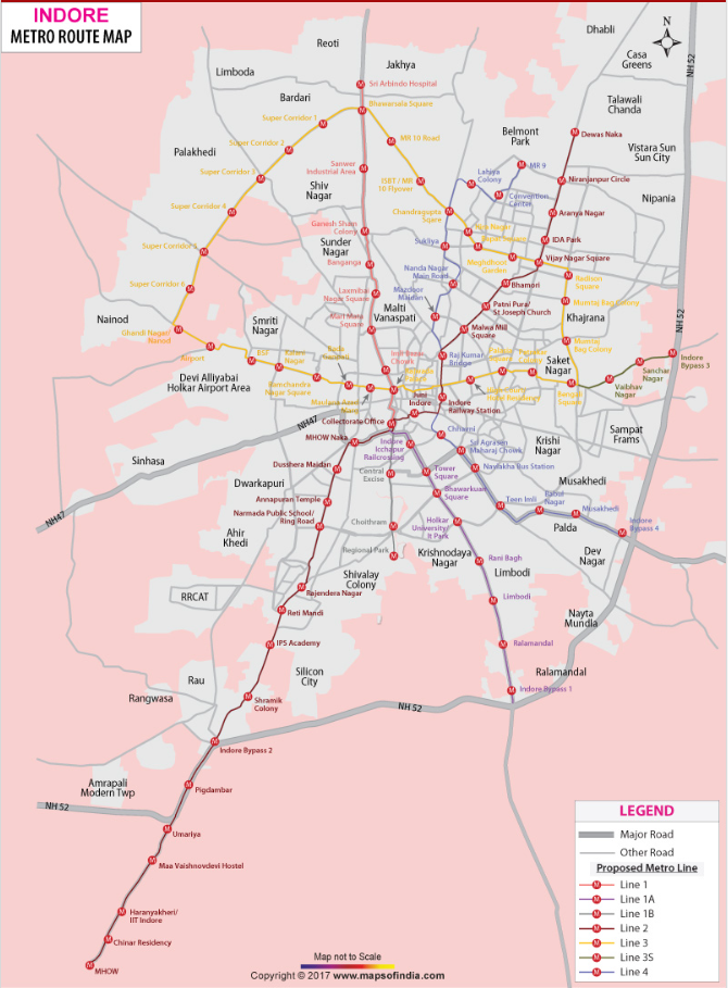 列车去向:博帕尔地铁27列车(81辆车),其中14 列服务于正在建设的 14.99 公里紫线,13列服务于即将到来的12.88公里红线;印多尔地铁25 列车(75 辆车),为 33.53公里的黄线提供服务。