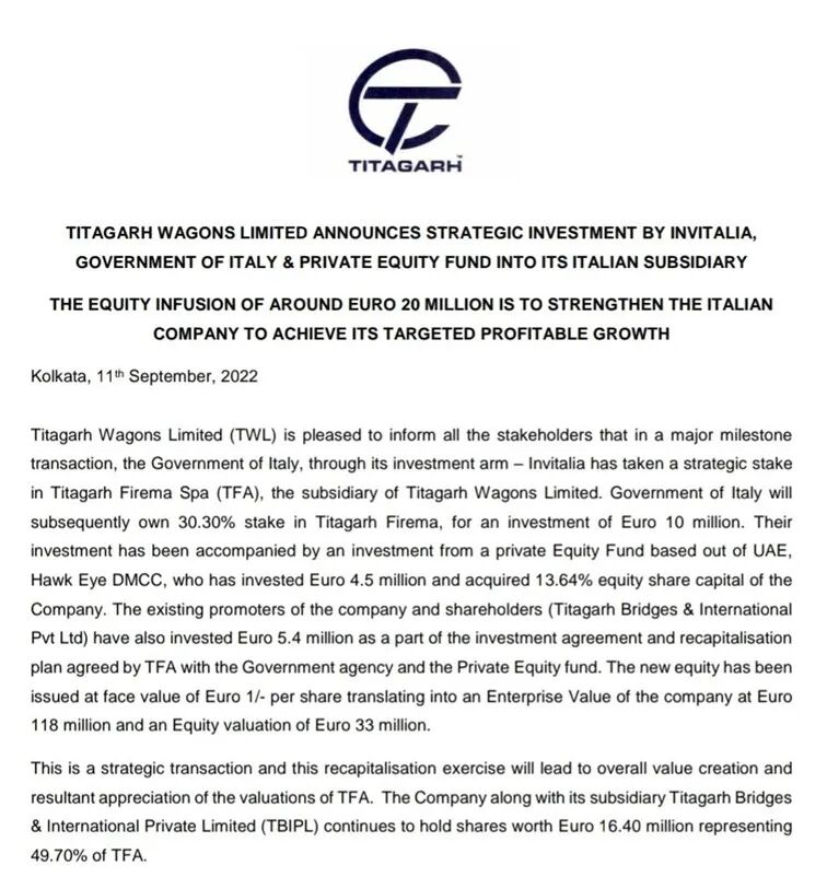 2022年7月,意大利政府计划收购Titagarh Wagons子公司Titagarh Firema SpA的股份。