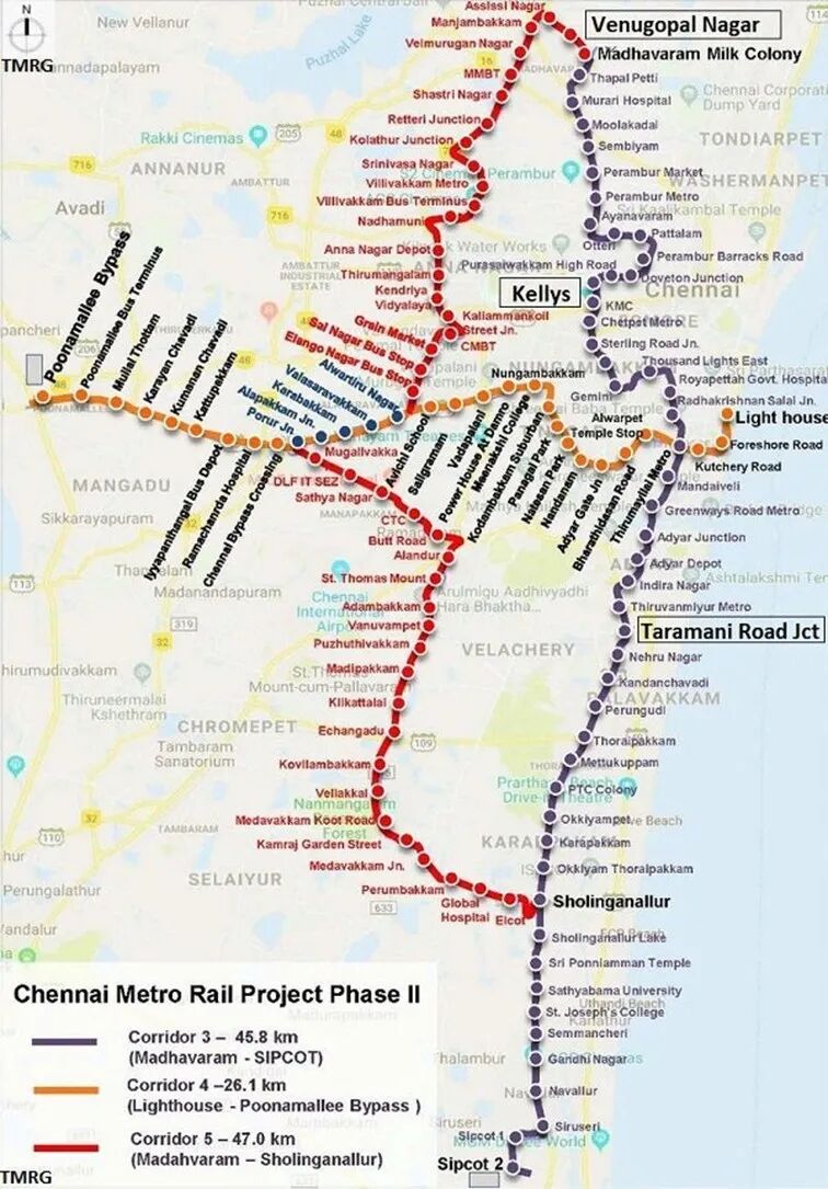 钦奈地铁二期项目共有3条线路,总长度为118.9公里,计划运行26列3辆编组列车,地铁车辆将在钦奈西部的波纳马勒车辆段进行列车维护。