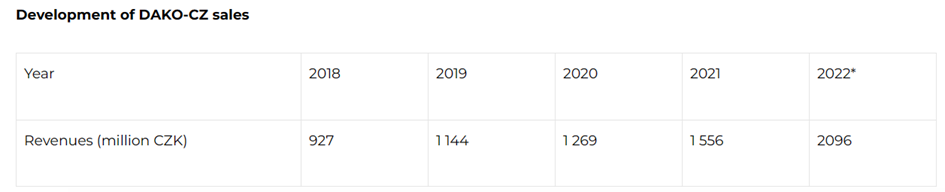 从数据上看,DAKO-CZ公司2018年至2021的销售额一直保持着稳定的上升,在2022年突破有明显上升,并首次突破20亿捷克克朗。