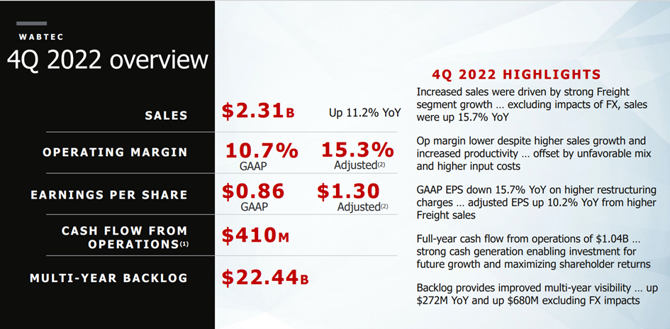 货运板块大幅增加!美国西屋制动2022年Q4收入23.1亿美元