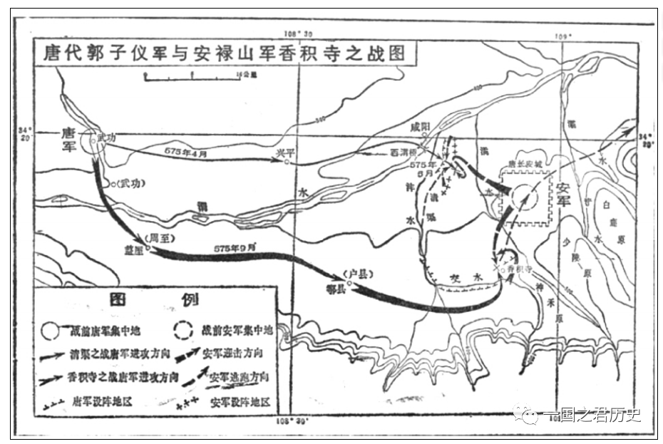香积寺位于长安城南十余公里处,北边是长安,南边是子午谷口,西边是沣水,东边是大山,周边植被茂盛,不利于骑兵大规模作战,唐军首先到达香积寺北,在这里列阵等待,军阵延续三十里,郭子仪这是选定战场与叛军交战。