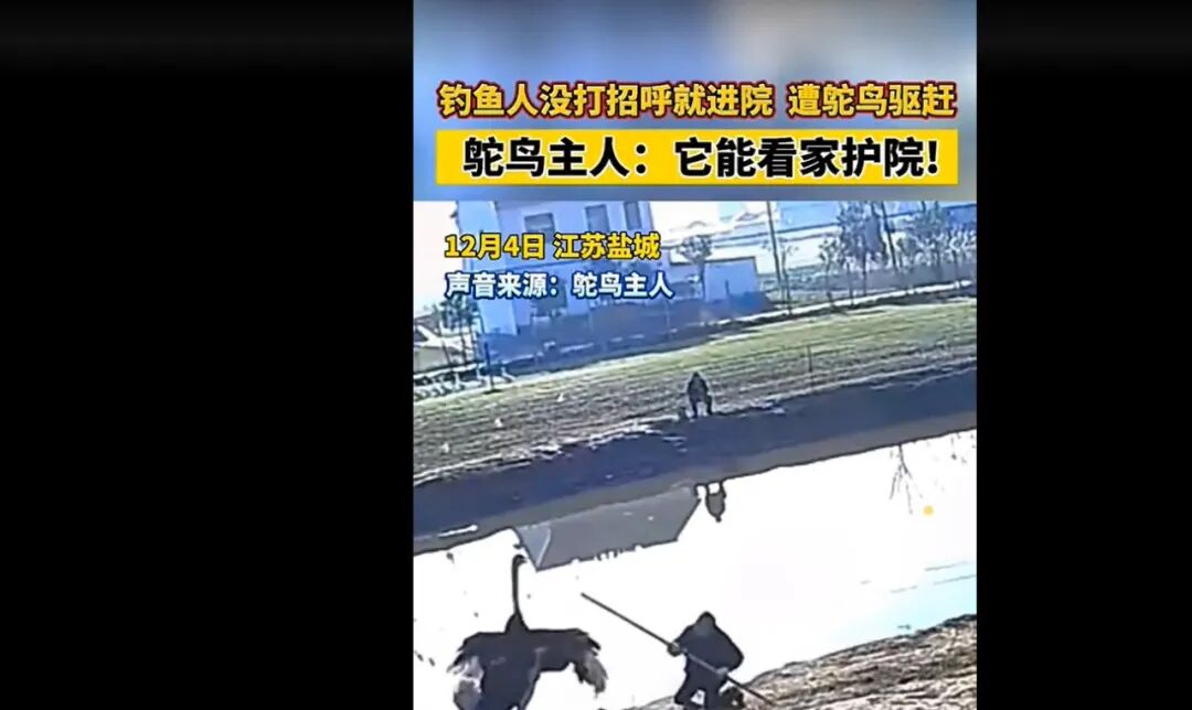 前几天刷到一条视频。视频中,一只鸵鸟在家中守护着鱼塘,一名男子擅自进入鱼塘钓鱼,结果被鸵鸟追赶还摔倒了,差点掉进河里去。鸵鸟的主人表示,这只鸵鸟已经养了3年,体重超过200斤,长大后便开始负责看家,任何进入它领地的人都会被它赶走。