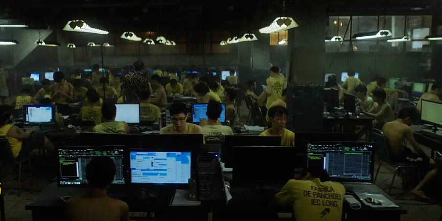 这里的员工如牲口一般,白天干着博彩、挖币、裸聊等各种诈骗工作,晚上被赶到老鼠流窜的宿舍,每天还要被陆经理(王传君饰)“想成功,先发疯,不顾一切向钱冲”的口号洗脑。