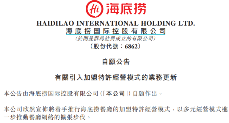 3月4日,正值海底捞30岁生日之际,公司正式宣布将引入加盟特许经营模式。
