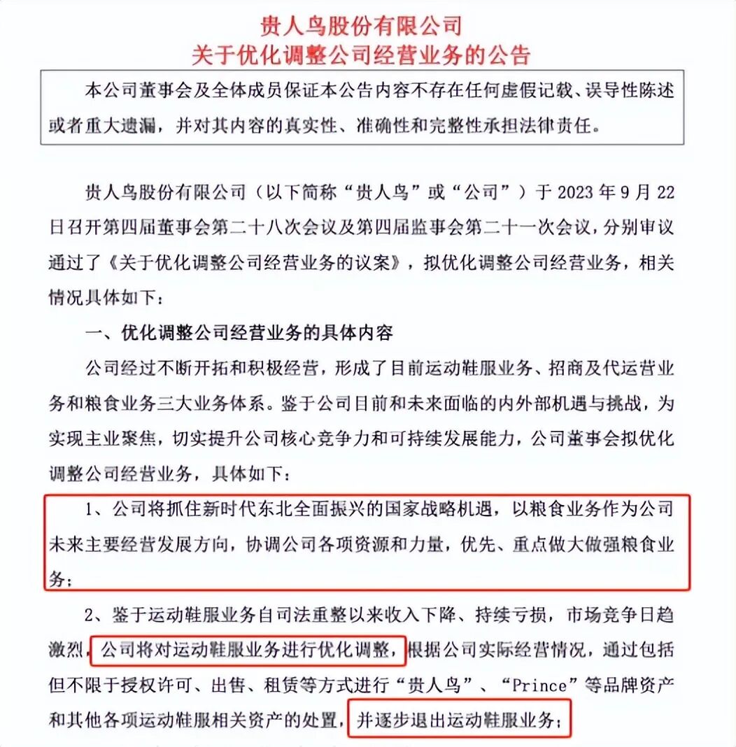 也是在去年9月份,贵人鸟曾发布公告,宣称未来将把粮食相关业务作为新的主营方向,并将逐步退出运动服饰相关业务,在当时还引起了不小的争议。