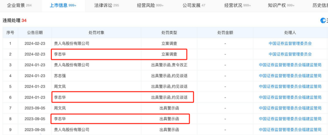 值得一提的是,从可靠机构查询所得的信息来看,在此次被立案调查之前,李志华已经多次被出具警示函,约见谈话和通报批评也都有记录。
