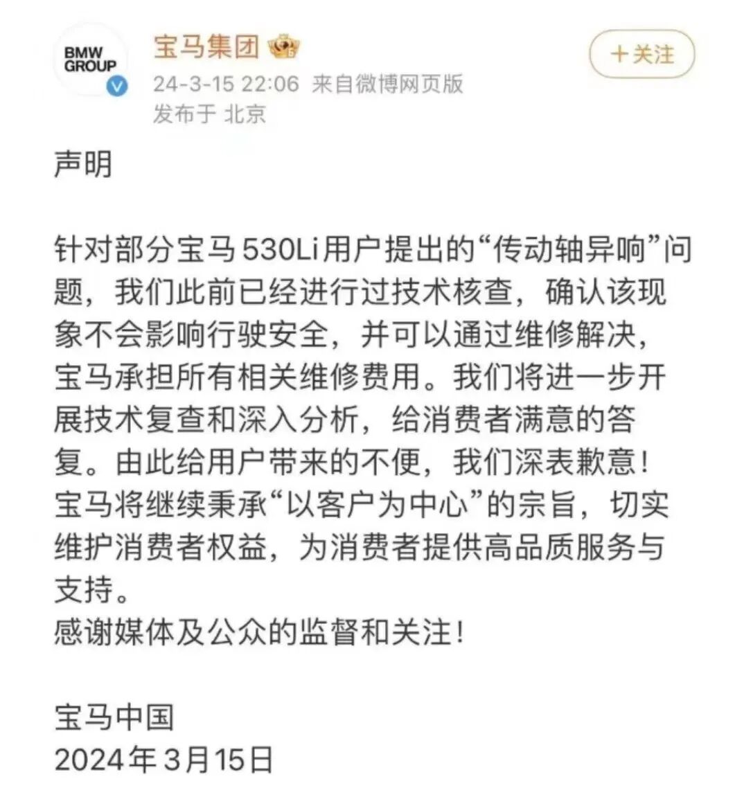 值得一提的是,在这个声明中,宝马方面称针对车主提出“传动轴异响”,他们做过了技术核实,不会影响驾驶安全。