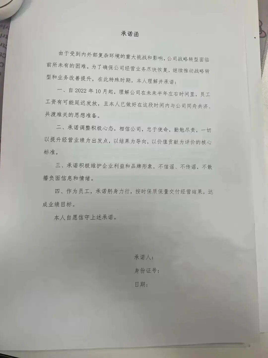 她要求员工签署承诺函,即便在工资无法按时到账的情况下,依然能够“勤勉尽责”,继续为业绩达标卖命。