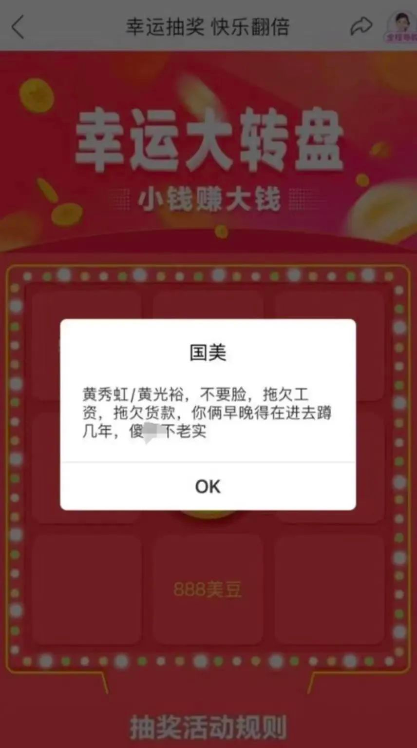 用户一旦点击进入,就会看到一条辱骂黄光裕兄妹的弹窗,言语用词火药味十足。
