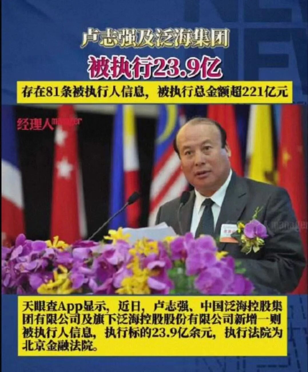 作为老板的卢志强,在被动清算资产的同时,多次收到法院数次催缴债务的通知,负债总额高达2000多亿。