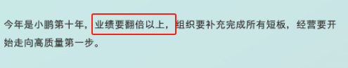 除此之外,何小鹏在信中还大胆明确了今年的业绩目标,2024年是小鹏汽车创立的第十年,他也计划在今年带领品牌完成业绩翻倍,让经营走向高质量。