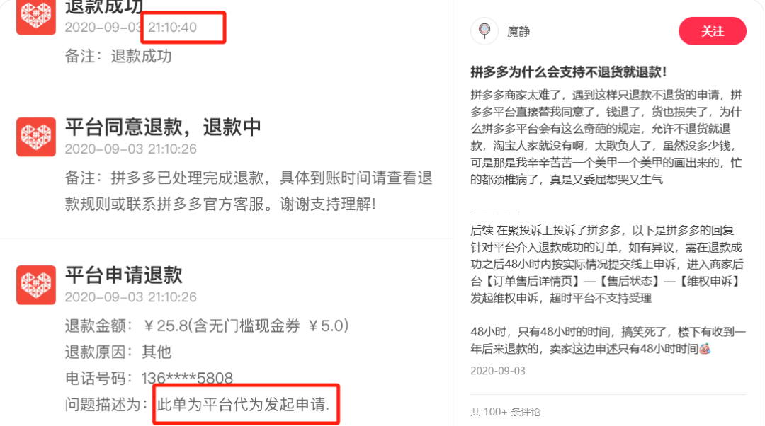 经调查后确认,这是一起有组织的行动,而其中的一批主要参与者,正是深受“仅退款”机制坑害的拼多多店主。