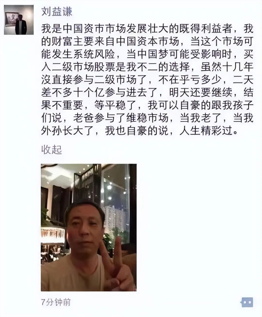 后来,他说:“我是中国资本市场发展壮大的既得利益者,财富主要来自中国资本市场,当这个市场可能发生系统风险时,买入二级市场股票是我的不二选择。”