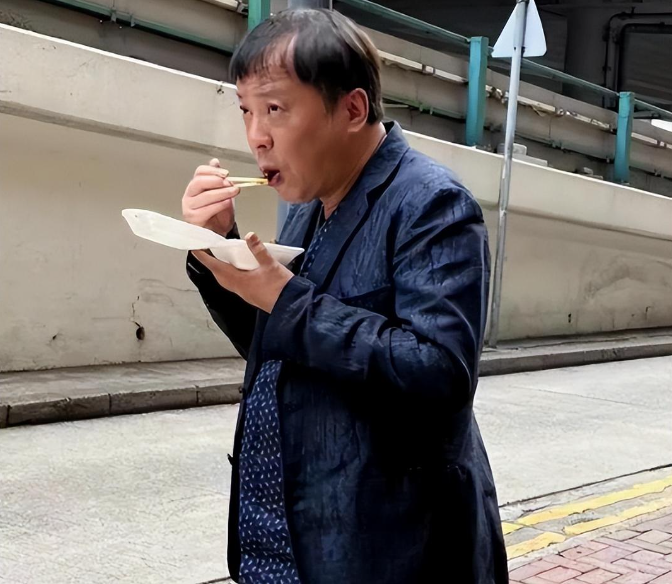 照片中的男人,穿着邋遢,站在街头捧着盒饭,狼吞虎咽。