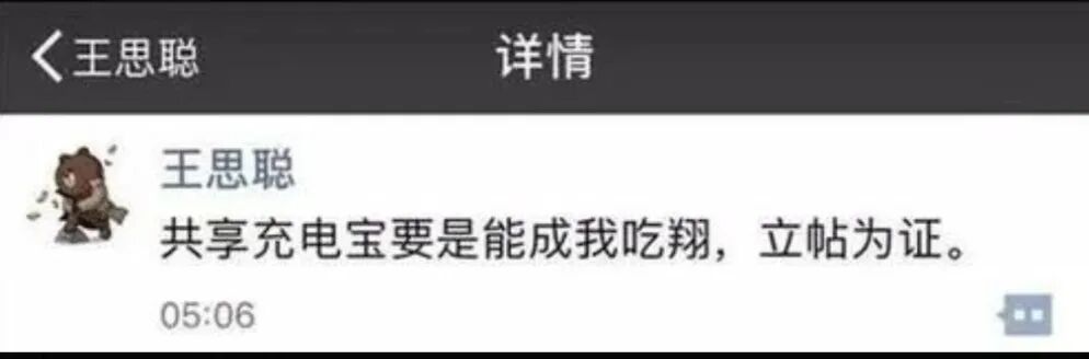 眼看各方资本为了能在共享充电宝领域里分一杯羹使劲浑身解数,万达少东家王思聪着实有点看不下去,便如文章开头的图片中一般“热心劝解”:“共享充电宝要是能成我吃翔,立帖为证”。