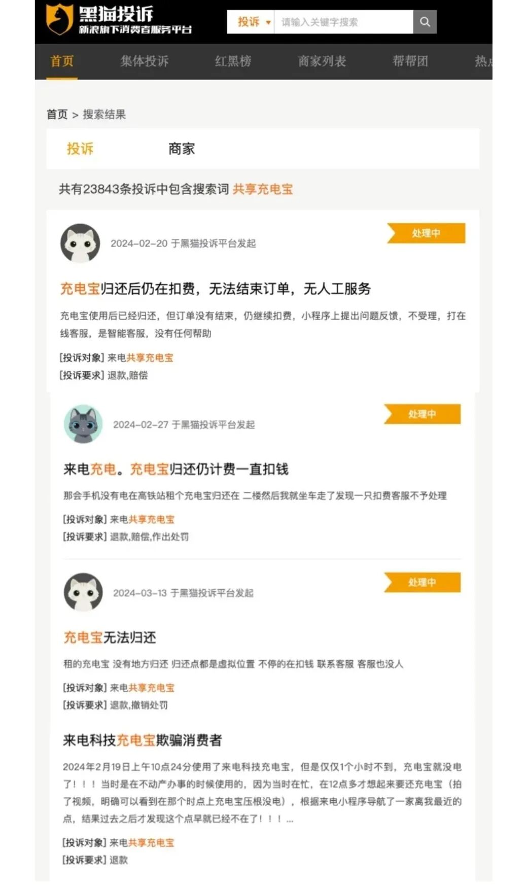 在黑猫投诉平台上,有关于共享充电宝的投诉更是多达2.4万条。