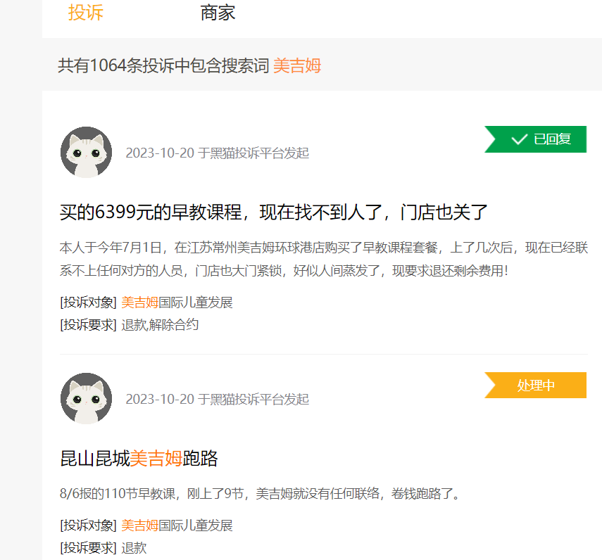 在新浪黑猫投诉上看,和美吉姆相关的内容多达1064条,纷纷指向找不到人、关店,退卡。