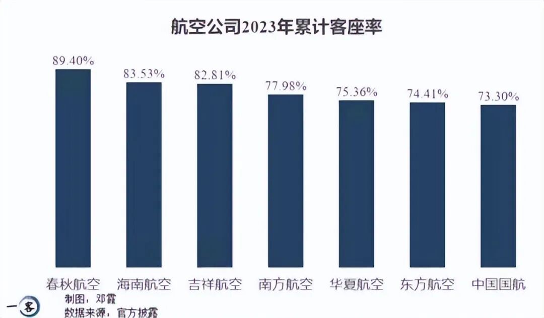 财报显示,2023年,中国三大航司(中航、南航、东航)的客座率均没有达到80%,而春秋航空的客座率却高达89.4%。