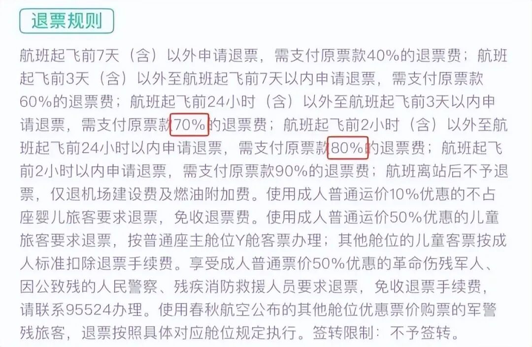 若是起飞前2小时到24小时退票,退票费将是原票款的80%。