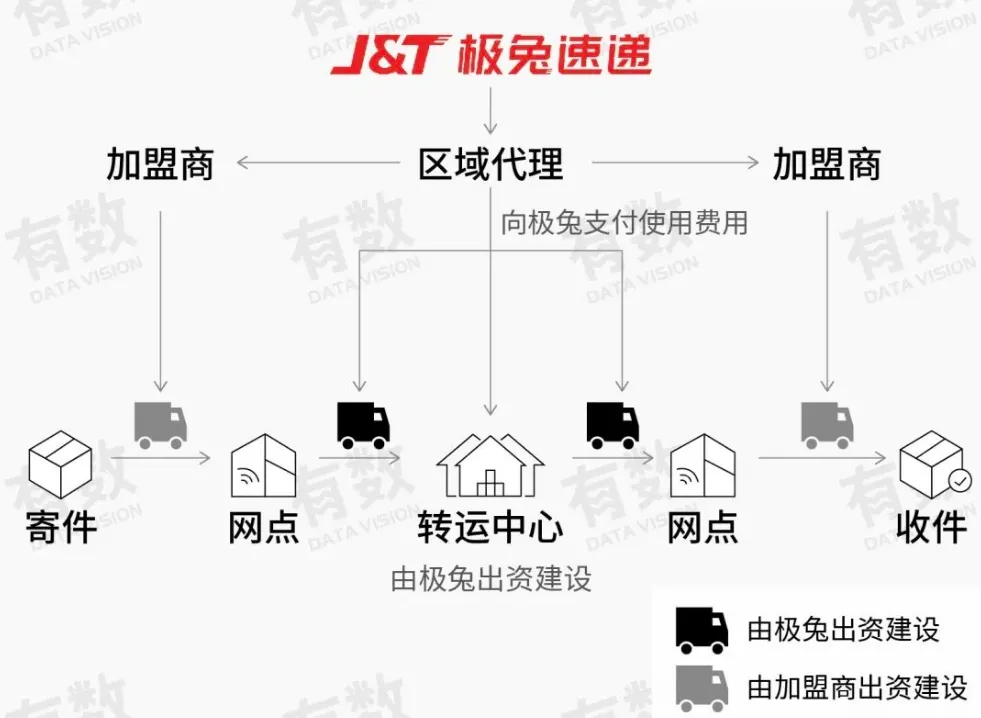 “买买买”可是并不能解决所有问题,并购后,极兔还要面临怎么经营的问题,而它能快速将这些资源整合在一起,搭建起全国网络,靠的就是“区域代理制”。