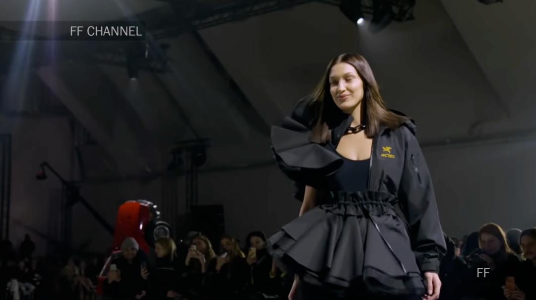 当时,知名潮牌off-white主理人Virgil Abloh上台致谢时,穿着的不是自己品牌的衣服,却是一件蓝色的始祖鸟冲锋衣。