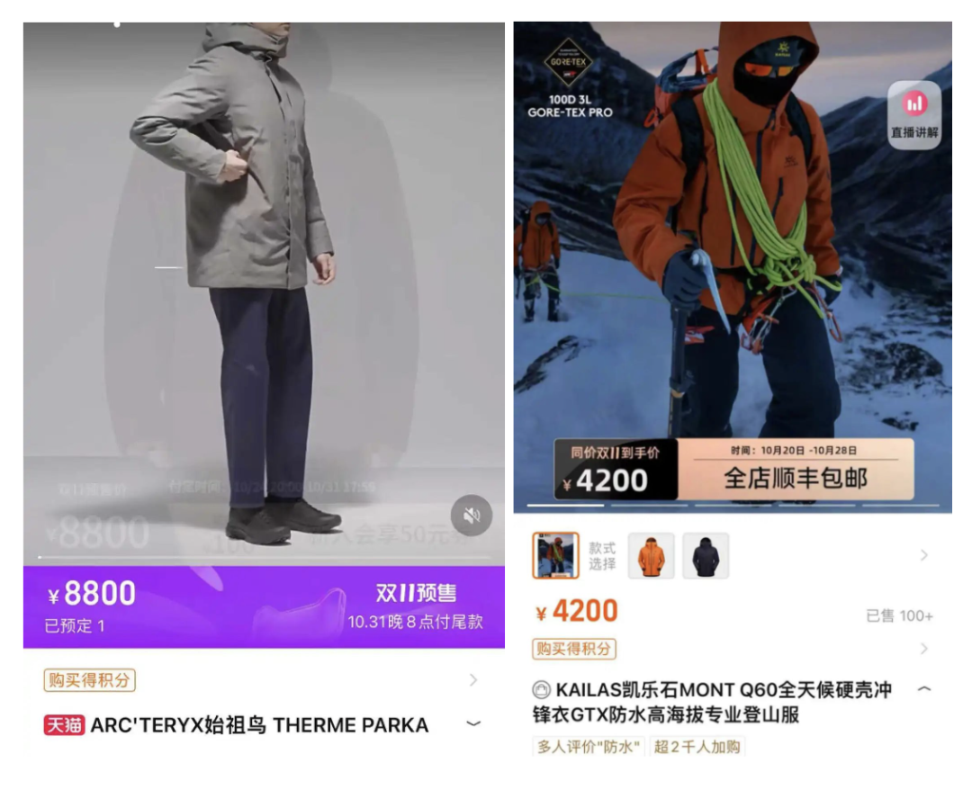 像今年上半年,在抖音直播间里销量最高的几款冲锋衣,一般价格都位于300-500元和100-300元这两个区间,其中300-500元占了市场的三分之一规模。