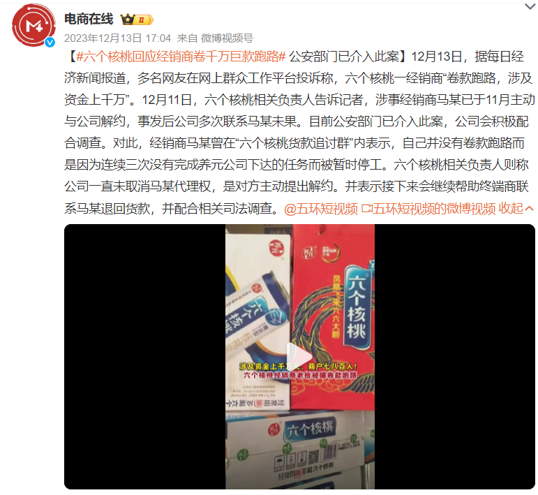 2023年年底,六个核桃某地经销商卷款千万跑路的一则消息,引起了行业哗然。