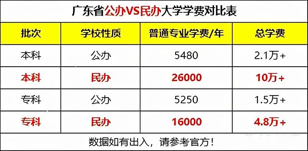 以广东省为例,民办本科高校学费普遍在25000元以上,而公办学校通常在6000元左右。