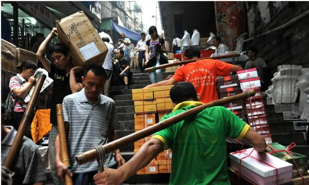 重庆是山城,坡多台阶多,很多货品都是靠人用一根扁担从船上挑上岸的,这就是重庆有名的“棒棒大军”,构成了朝天门一道独特的风景。