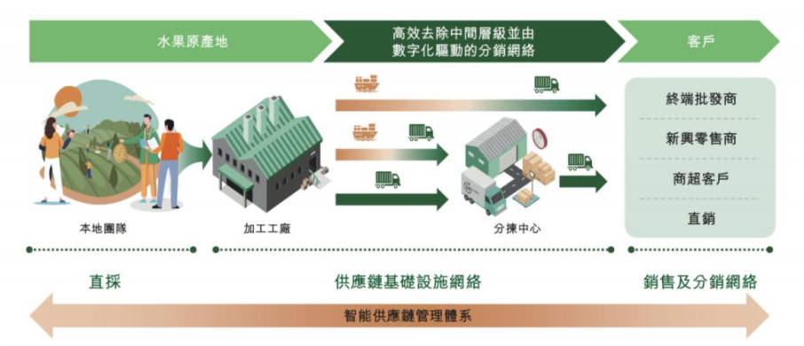 现在的“洪九果品”已经不仅仅是水果中间商,而是完成了从源头基地-生产加工--分销--物流--仓储--终端客户的全产业链,并开发了一套“洪九星桥”数字化供应链系统,实现了果品从种植到采摘,再到运输和销售的全渠道数字追踪。