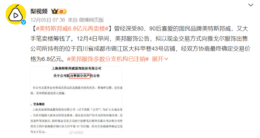 12月4日,美特斯邦威以6.8亿卖掉成都核心地段的房产,为品牌运营注入现金流。