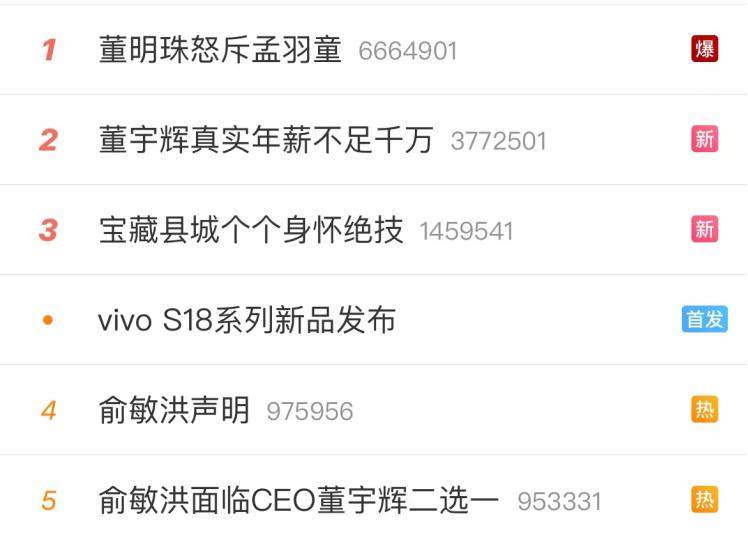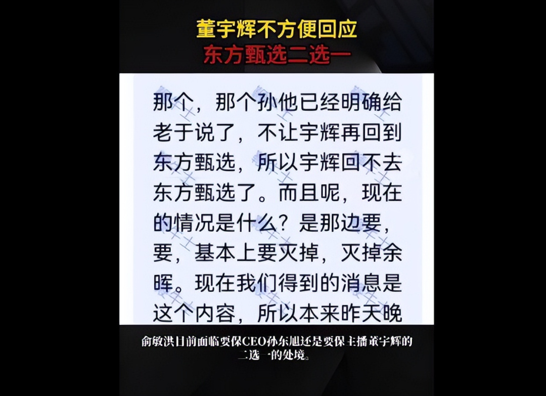 其二,则是去年帮助新东方缔造了“逆袭神话”的董宇辉,疑似遭到了东方甄选高层的排挤,甚至流出了CEO逼宫俞敏洪,要求老俞“二选一”的传闻。