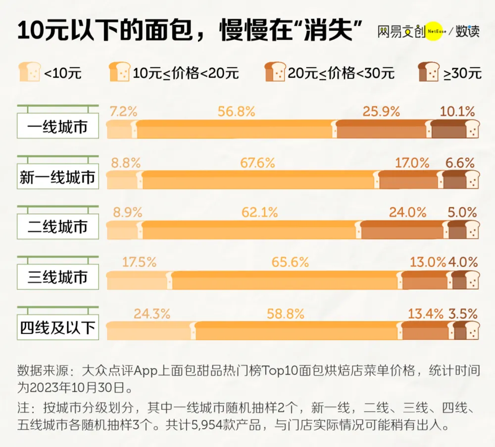 在这些小城市,面包低于10元仅有四分之一,在面包的消费上四、五线城市和一线城市的体验是差不多的。