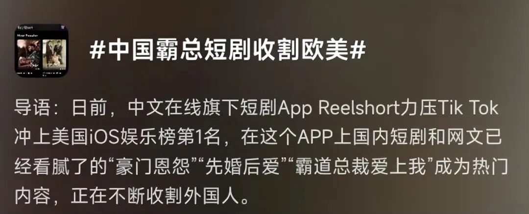 最近中国霸总短剧收割欧美的话题,引发大量讨论。