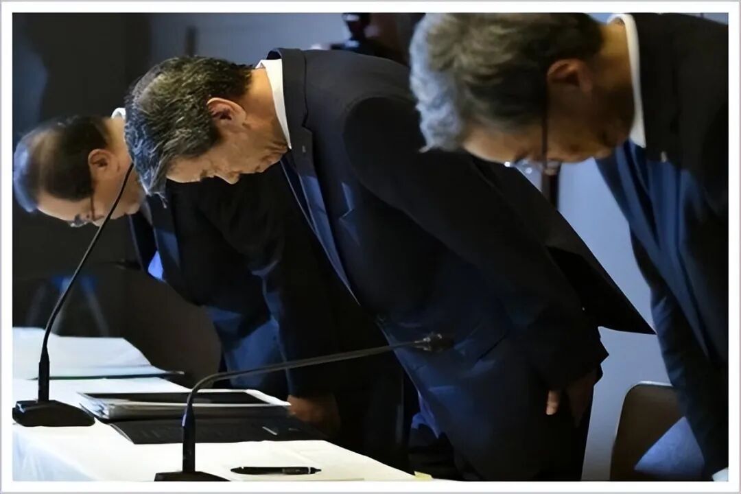 2015年,东芝三任社长齐刷刷起身,面对媒体和镜头深深鞠躬。