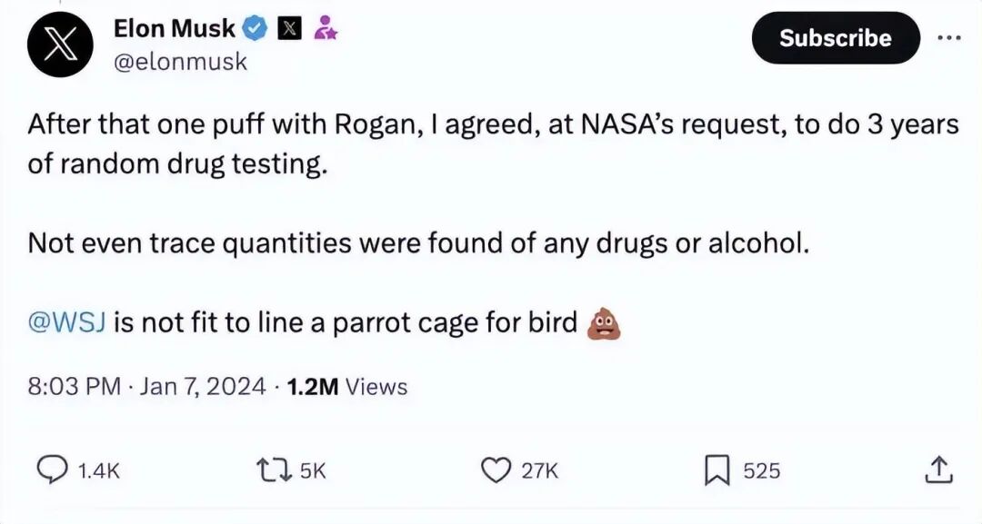 1月6日,马斯克被《华尔街日报》曝出吸毒,然后直接霸气发文回怼他们的报纸: