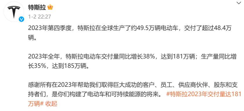 从特斯拉1月2日官方公布的数据来看,2023年的电车销量和成交量同比增长都超过了30%,成绩可以说很不错了。