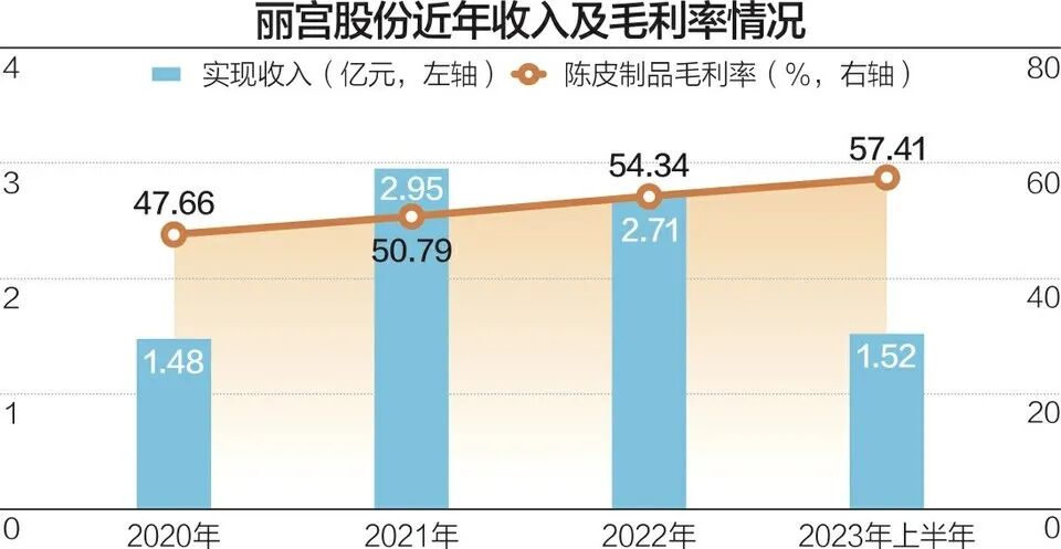 更可怕的是,依据丽宫股份新披露的招股书显示,得益于旗下陈皮产品售价的大幅度提高,公司2023年上半年的毛利率已经达到了恐怖的57.4%,直逼六成。