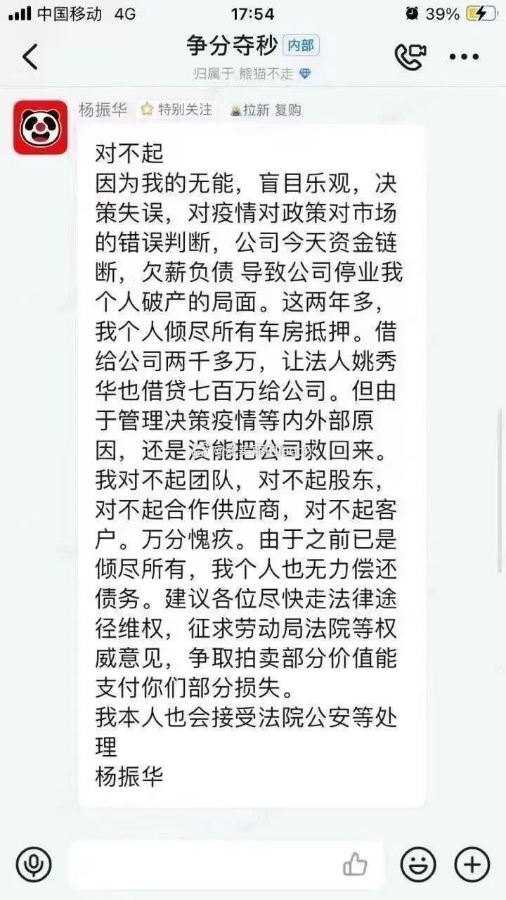 严格来讲,杨振华的失联也并非毫无预兆,前不久他本人还曾在公司内部大群发布了一条长消息,内容表达非常直白,相当于对内提前宣布了公司倒闭的消息: