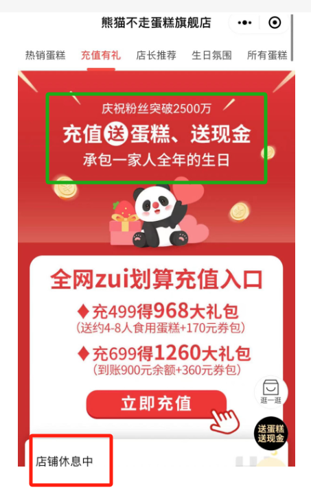 当下再打开熊猫不走的官方小程序,开屏界面依然是“充值送蛋糕”的优惠活动简介,但如果搜索附近门店详情,每一家都显示“店铺休息中”,全都不营业。
