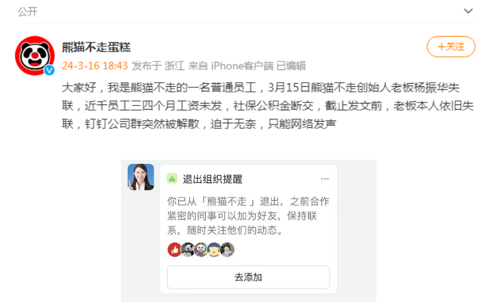 据这条博文内容显示,自3月15日起,熊猫不走内部员工已经无法与创始人杨振华取得联系,老板疑似跑路,员工们也已经被公司内部钉钉群踢除。